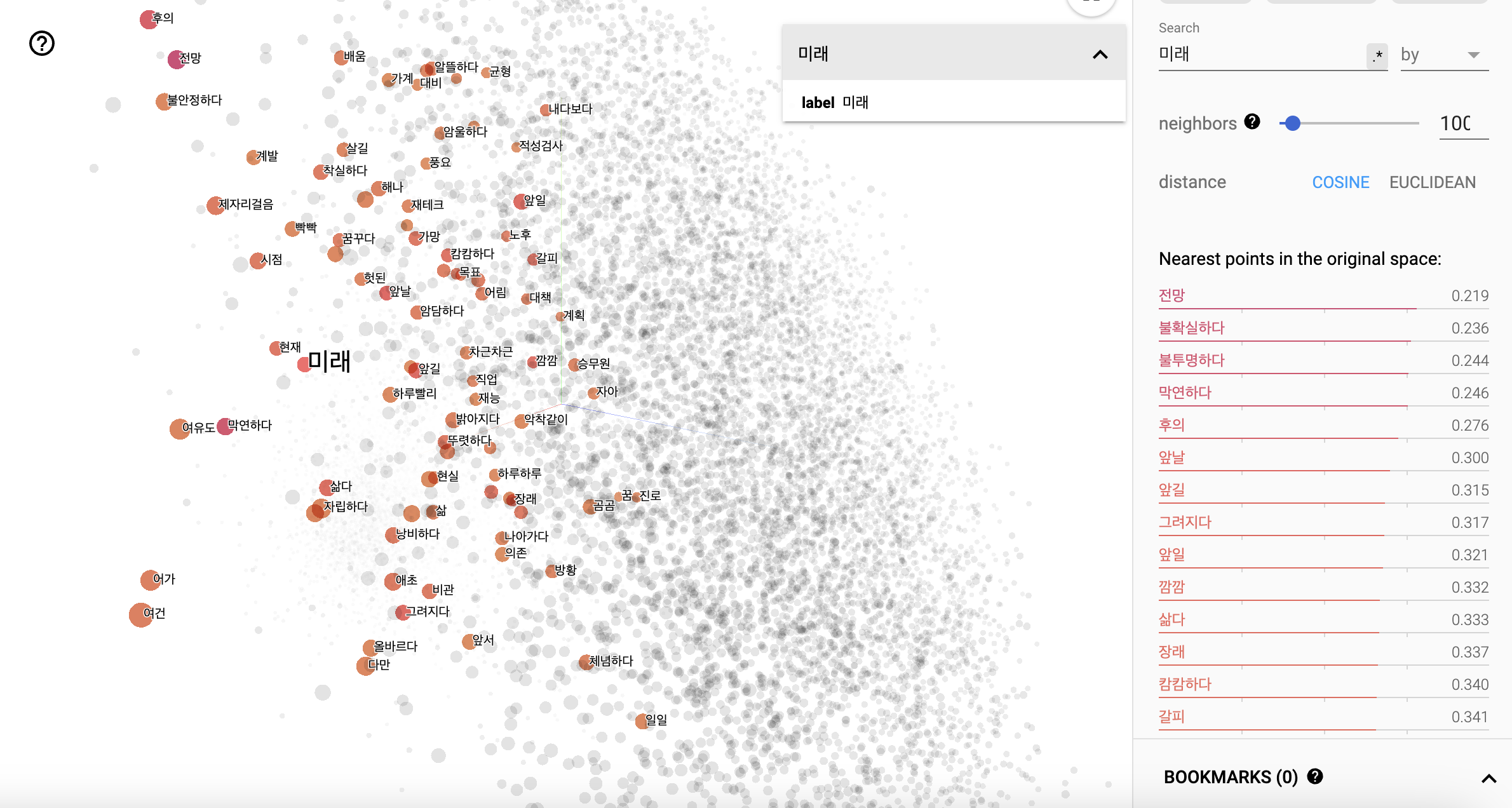 # 학습된 단어 벡터 확인 embedding_matrix = model.wv.vectors # 결과 출력 print("Shape of Embedding Matrix:", embedding_matrix.shape) print("Embedding Matrix:\n", embedding_matrix) out_v = open('vects.tsv', 'w', encoding='utf-8') out_m = open('meta.tsv', 'w', encoding='utf-8') for i in range(len(tags_counts)): word = list(tags_counts.keys())[i] embeddings = model.wv[word] out_m.write(word + '\n') out_v.write('\t'.join([str(x) for x in embeddings]) + '\n') out_v.close() out_m.close() # Embedding projector https://projector.tensorflow.org/ 를 이용하여 word embedding 시각화 # embedding layer 의 weight 를 disk 에 write. # Embedding projector 사용을 위해 embedding vector file 과 단어가 들어 있는 meta data file 로 구분하여 upload.- "친구", "미래" 등의 단어를 검색했을 때, 비슷한 의미를 가진 단어들이 비슷한 벡터 공간에 있는 것을 확인할 수 있다. 엄청 신기하다!